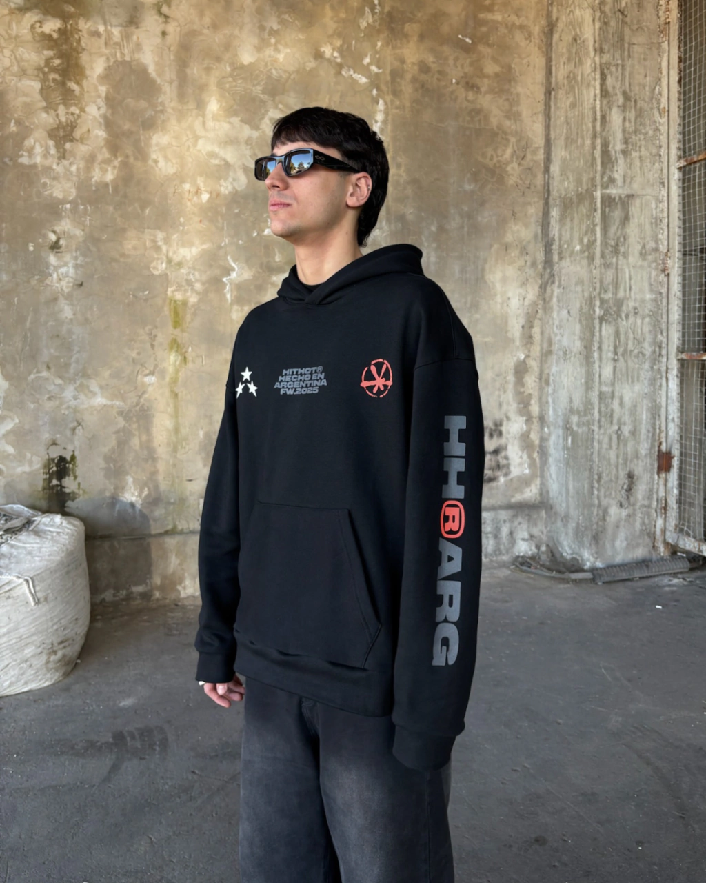 Buzo negro con estampa delantera, trasera y en mangas hecha en serigrafía. La capucha contiene una etiqueta de marca bordada en alta definición.