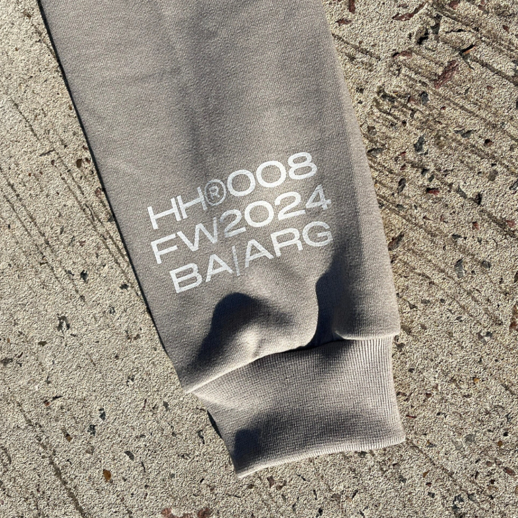 Buzo color visón con estampa delantera y trasera hecha en serigrafía con tinta ecológica al agua. También contiene estampa en manga derecha. En la manga izquierda tiene una etiqueta bordada en alta definición.