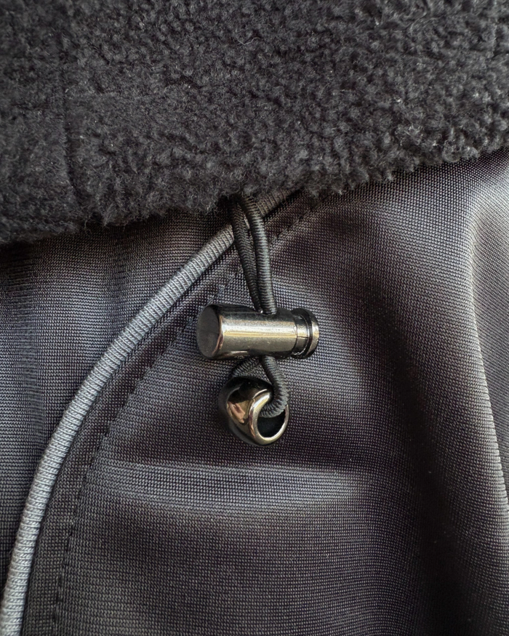 Polar color negro con estampas bordadas en parte delantera y trasera. La manga izquierda contiene una etiqueta de marca bordada en alta definición. Cierre del cuello marca YKK. La parte de la cintura es ajustable mediante tancas con cordón elástico.