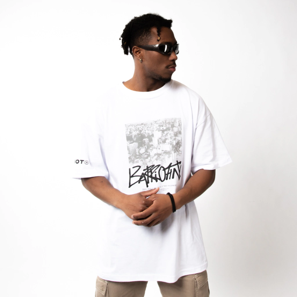 Remera blanca estilo oversize con estampa delantera hecha en serigrafía con tinta ecológica al agua. También contiene estampa en manga derecha.